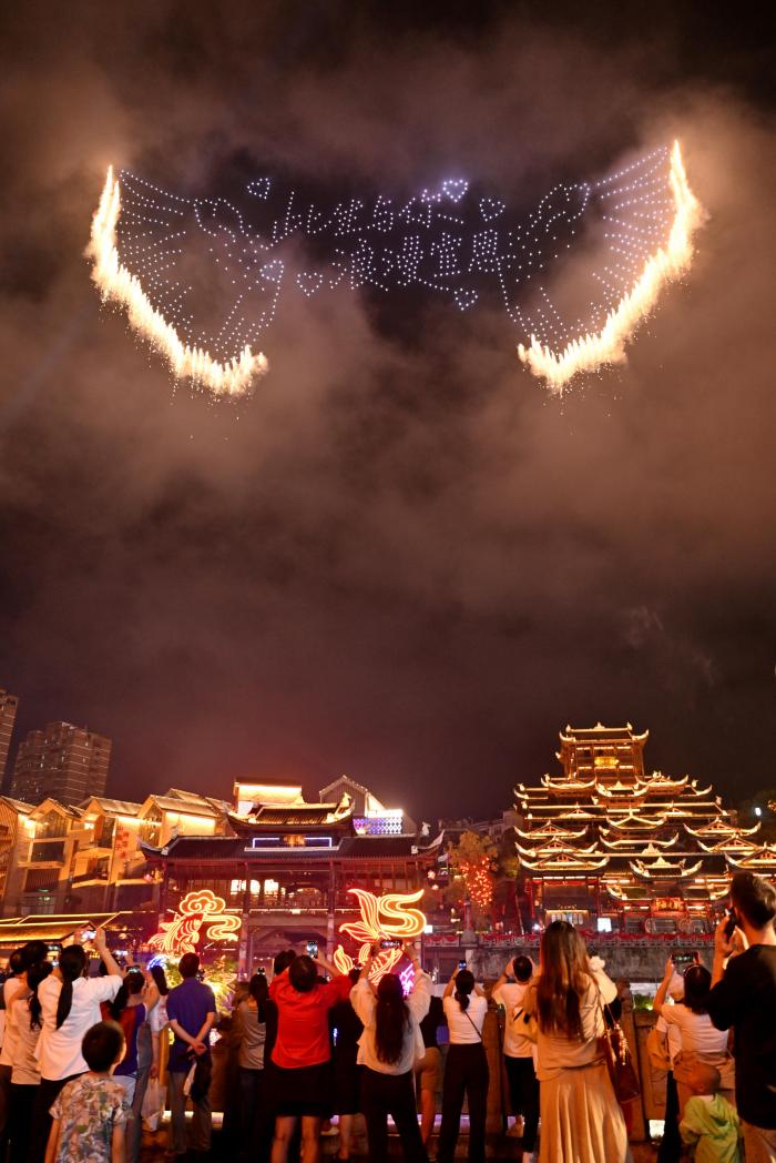10月2日晚,游客在湖北省宣恩县城兴隆老街观看无人机烟花秀。新华社发(宋文摄)