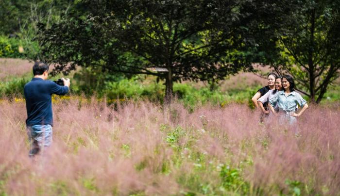 10月3日,游客在贵州省黔南布依族苗族自治州长顺县神泉谷景区内拍照留念。新华社记者 陶亮 摄