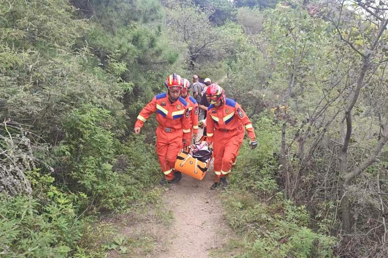 10日3日,一名女子不慎受伤,北京密云消防迅速前往搜救,并将人安全带到山下。