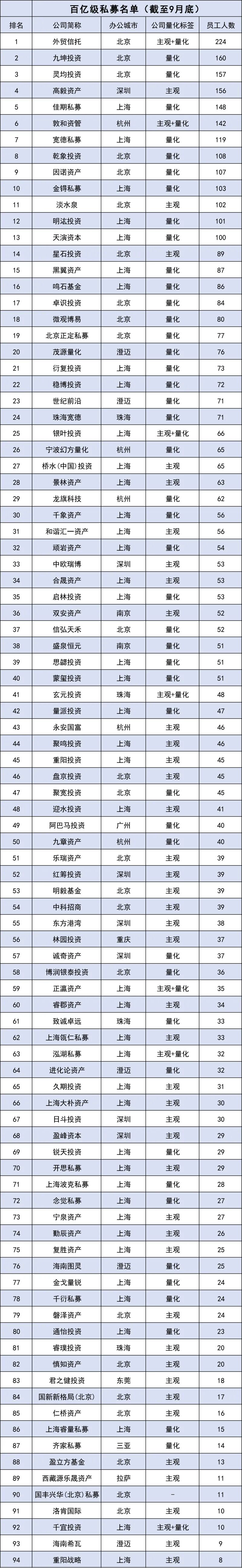 私募排排网数据显示,截至9月29日,百亿私募数量较8月底增加3家,总数达94家。具体来看,正瀛资产和开思私募新进百亿梯队,红筹投资则重回百亿行列。