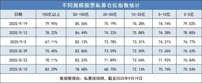 据私募排排网统计,截至9月19日,管理规模在100亿元以上和管理规模在50亿元-100亿元之间的股票私募仓位指数分别为79.95%、85.56%,其中,百亿级股票私募已连续两周进行加仓,仓位指数相比于9月5日增长了12.84个百分点。