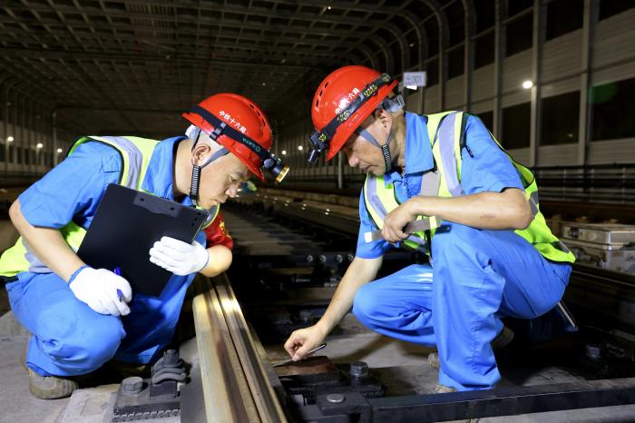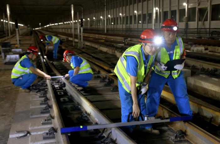 10月4日,中铁十六局铁运公司维保人员在重庆轨道交通十八号线检测钢轨轨距。新华社发(付玉忠 摄)