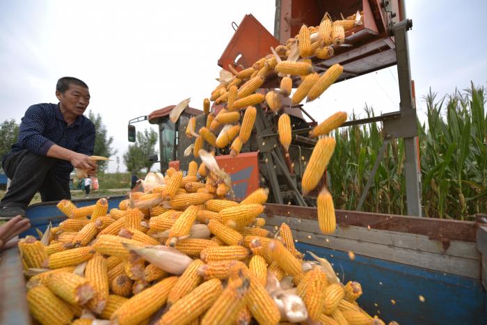 10月4日,在山东省聊城市茌平区贾寨镇,村民将收割的玉米装车。新华社发(赵玉国摄)