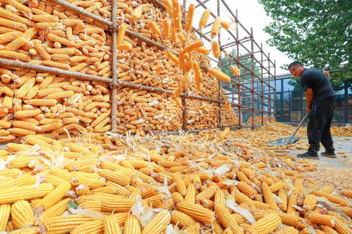 10月4日,河北省石家庄市藁城区绿之宝家庭农场的农民将收获的玉米进行打垛储藏。新华社发(张晓峰 摄)