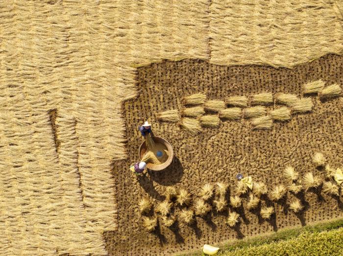 10月3日,农民在云南省大理白族自治州洱源县右所镇收割水稻(无人机照片)。新华社发(罗新才摄)