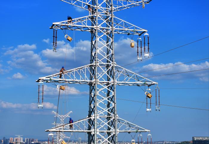 10月3日,在湖南省衡阳市雁峰区岳屏镇,施工人员在真武-麻塘220千伏线路改造工程项目开展架线施工作业 (无人机照片)。新华社发(曹正平摄)