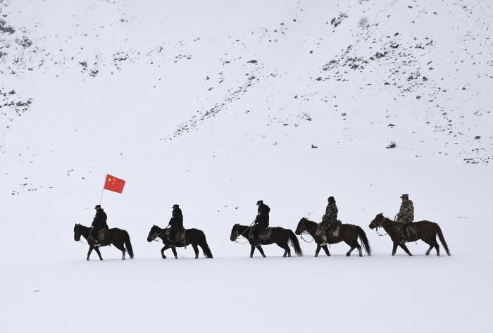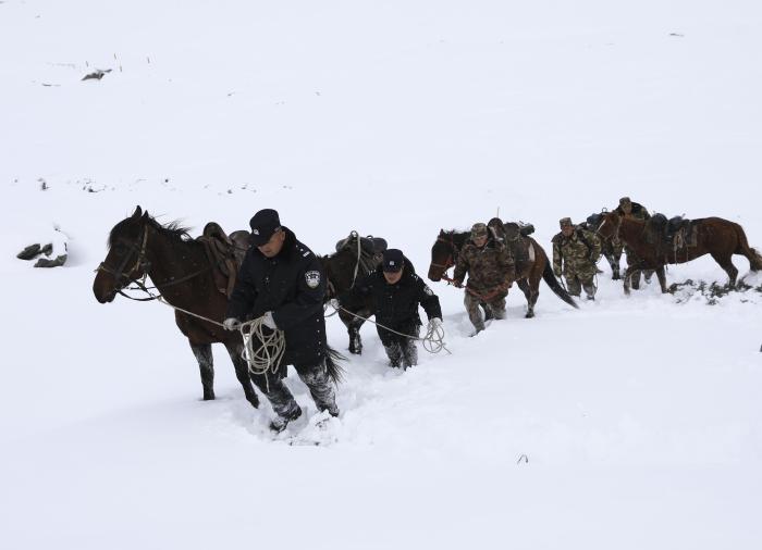 10月2日,新疆阿勒泰边境管理支队库尔木图边境派出所民警与护边员组成的巡逻队在风雪中策马巡逻。新华社发(叶尔江·木哈买提摄)