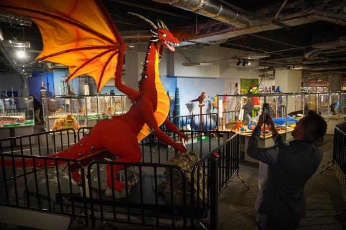 10月3日,参观者在波兰华沙举行的乐高积木展上拍摄巨龙模型。
