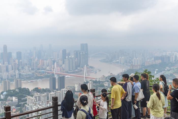 10月2日,游客在重庆市南岸区老君洞观景平台欣赏城市景观。新华社记者 黄伟 摄