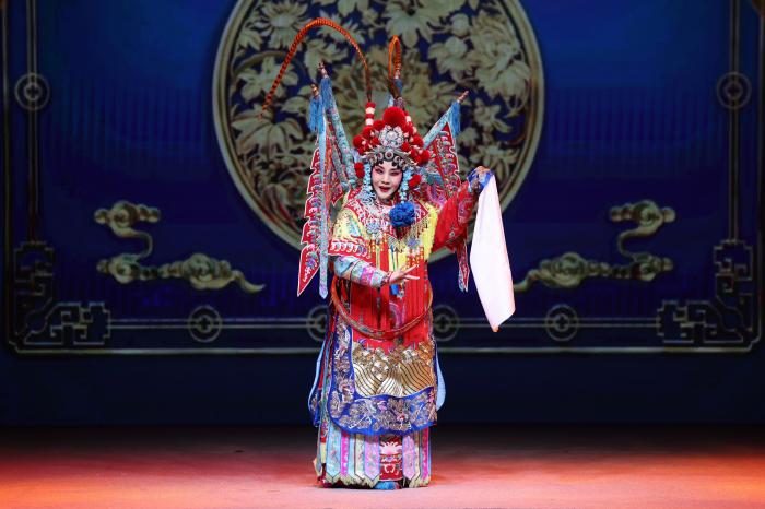 10月3日,在沙特阿拉伯首都利雅得,北京市河北梆子剧团演员表演河北梆子《穆桂英挂帅》选段。
