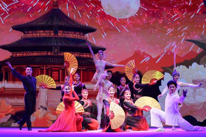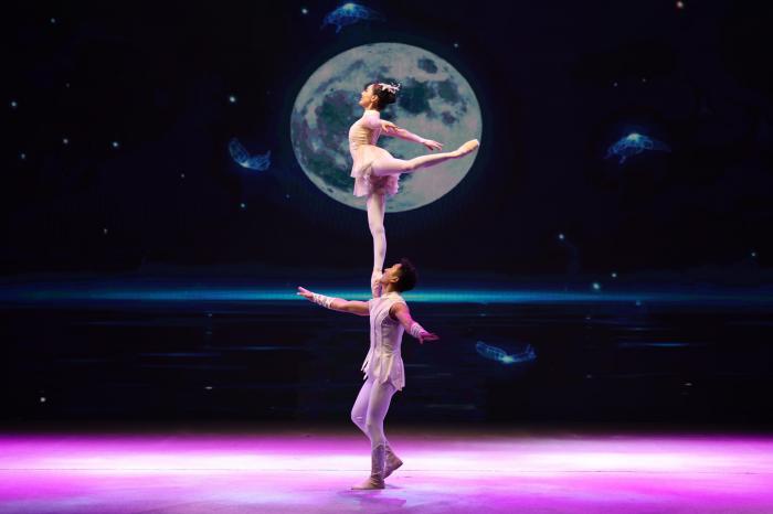 10月3日,在沙特阿拉伯首都利雅得,中国杂技团演员表演杂技《邀月弄影——肩上芭蕾》。