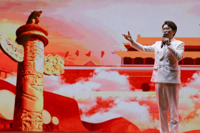 10月3日,在沙特阿拉伯首都利雅得,北京歌剧舞剧院演员演唱歌曲《不忘初心》。