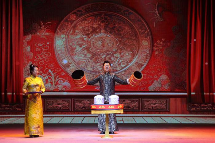 10月3日,在沙特阿拉伯首都利雅得,中国杂技团演员表演魔术《罗圈献彩》。