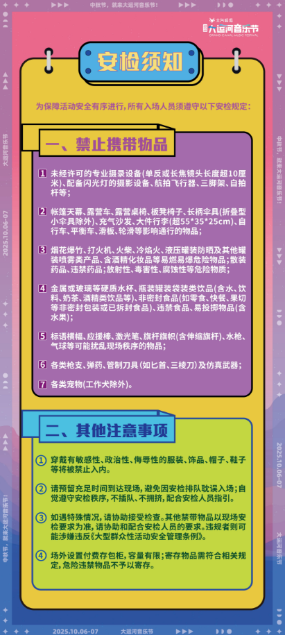 在此提醒乐迷朋友们入场安检时,鸣笛类口哨等可能干扰秩序、引发混乱的物品需要暂时交由工作人员保管(散场后可取回)感谢大家的理解和配合让音乐成为现场唯一的主旋律