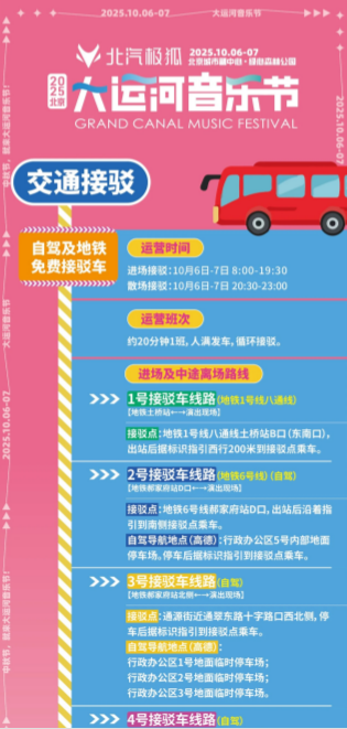 我们为大家准备了自土桥地铁站、郝家府地铁站往返于音乐节现场之间的免费交通接驳车,乘坐地铁前往的观众可在1号线八通线土桥站B口或6号线郝家府站D口出站后乘车前往音乐节现场。02