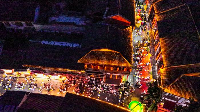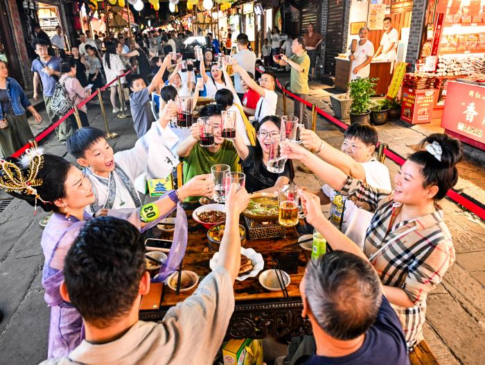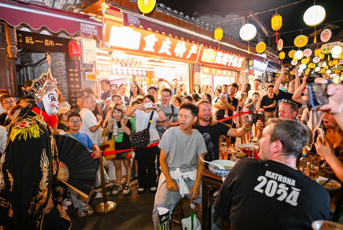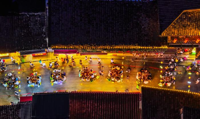 位于嘉陵江边的重庆磁器口古镇始建于北宋年间。近年来,当地统筹推动文旅融合与城市更新,在保留古镇原有街巷布局的基础上,把传统文化融入街区、植入景点,让这座千年古镇焕发出新的生机。这是10月5日拍摄的重庆磁器口古镇长街宴活动现场。