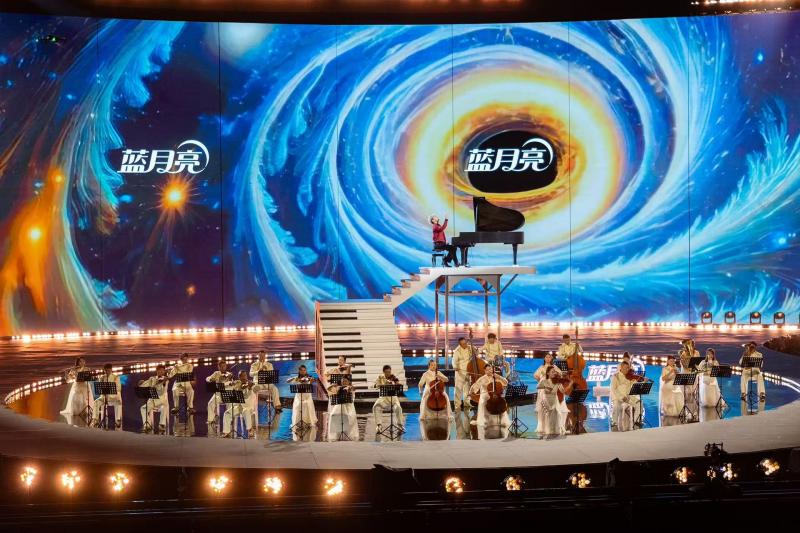 本次晚会最大的创新在于打破传统舞台表演模式,通过多维度技术手段重新定义“人——月——舞台”的关系。依托漳泽湖天然水域,制作团队打造360度环形水景舞台,结合水幕投影、AR、VR、XR等技术,实现“地月场景切换”,营造出极具沉浸感的神话意境。国际钢琴家马克西姆与国家级非遗“上党八音会”及长治交响乐团合作,演绎改编版《云宫迅音》,加上无人机秀与裸眼3D视觉,这种神话叙事与科技美学的结合,既是对文化根脉的致敬,亦是对年轻观众审美需求的精准回应。
