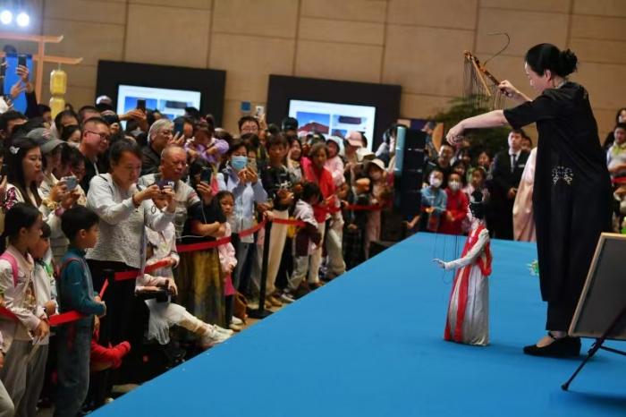 舞台上,传承人指尖轻提细线,木偶灵动演绎出嫦娥在月宫俯瞰人间美景的片段,随着丝线起落,偶人服饰呈现四季变化,细腻的动作、鲜活的神态,让木偶仿佛拥有生命。