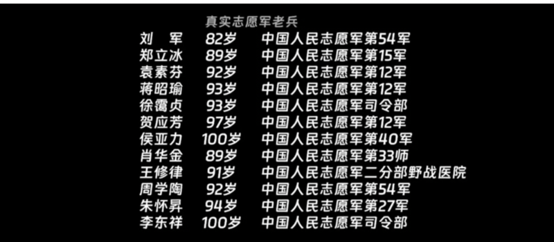 在影片结尾,银幕上缓缓浮现12个名字,他们是真实的志愿军老兵,每一位都已经超过80岁,多数在90岁以上,更有几位已是百岁老人。