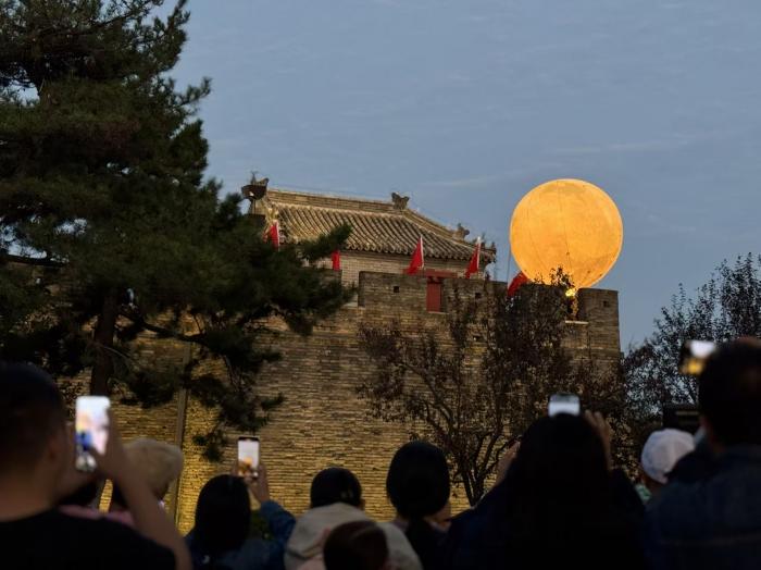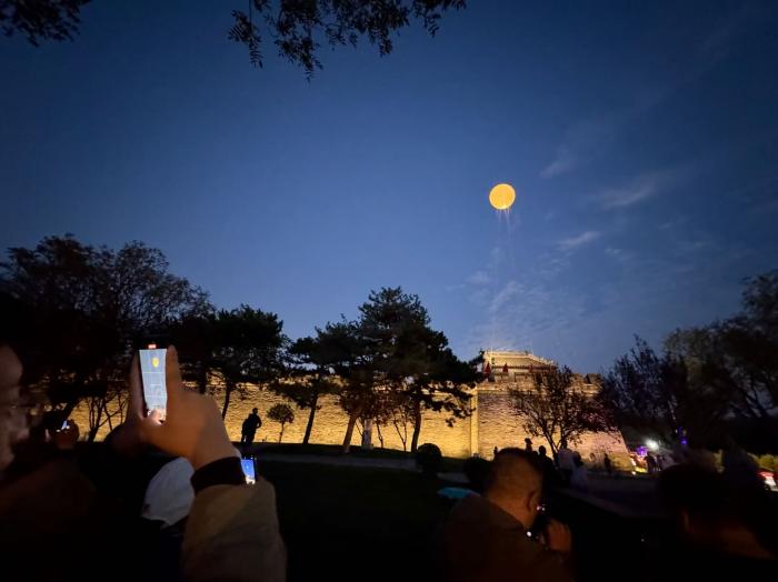 国庆中秋双节期间,宛平城再现“卢沟晓月”盛景,直径5米的“光影月亮”从西南城墙缓缓升空。