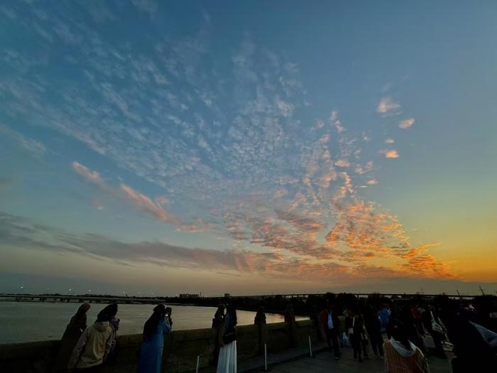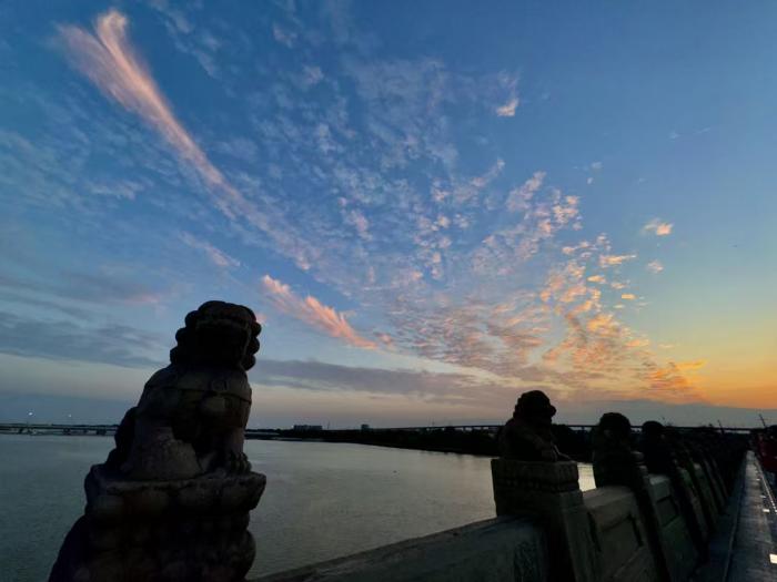 10月6日傍晚,北京天空铺展绚丽晚霞,橙红霞光如丝绸漫卷天际。卢沟桥景区成为市民打卡热门地,古桥、石狮在霞光中镀上金边,市民纷纷驻足拍摄,定格这份自然与历史交织的美景。