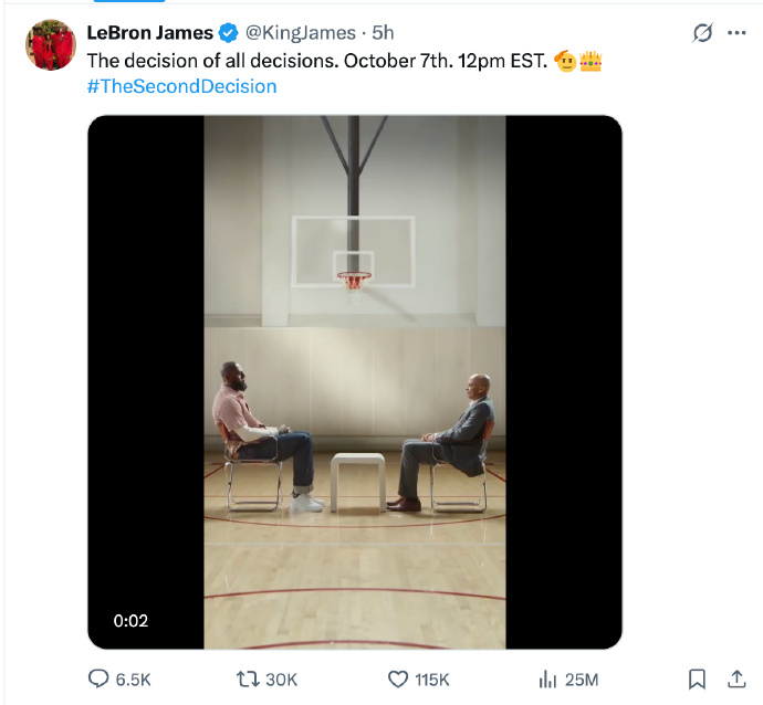 10月7日,湖人巨星詹姆斯在社交媒体发布了一个名为“第二次决定”的短视频。“第二次决定”将在北京时间10月8日0点正式对外公布。关于“第二次决定”是什么内容,并未有明确说法,但外界猜测认为这将与詹姆斯退役时间有直接关系。2025-26赛季将是詹姆斯职业生涯的第23个赛季,他将再次创造历史。此前,詹姆斯一直没有给出自己退役的明确时间表。