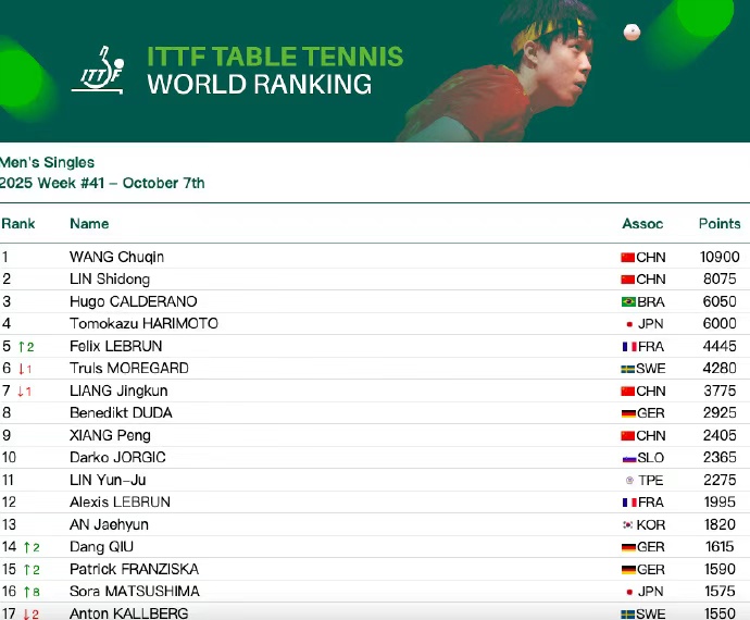 林诗栋以8075分位列第2,雨果6050分排名第3,梁靖崑位列第7,向鹏位列第9。WTT中国大满贯男单亚军费利克斯·勒布伦排名上升2个名次位列第5。八强宇田幸矢排名上升7个名次位列第26;八强陈俊菘排名上升67个名次位列第46,刷新个人职业生涯排名新高;十六强弗拉芬·科顿排名上升9个名次位列第43,刷新个人职业生涯排名新高;十六强爱德华·约内斯库排名上升24个名次位列第50,刷新个人职业生涯排名新高;十六强滨田一辉排名上升27个名次位列第51,刷新个人职业生涯排名新高。
