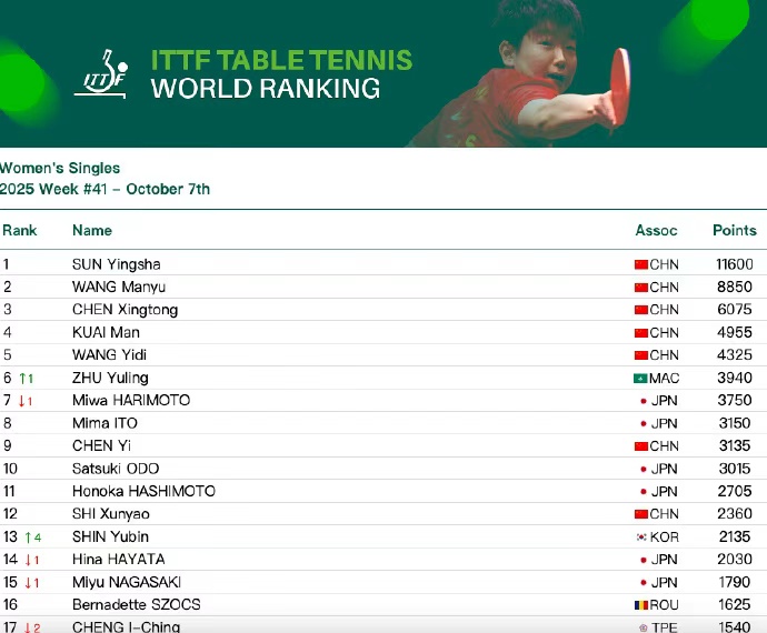 女单方面,中国队球员孙颖莎、王曼昱、陈幸同、蒯曼、王艺迪位列前五,陈熠位列第九。WTT中国大满贯女单四强申裕斌排名上升4个名次位列第13;八强朱雨玲排名上升1个名次位列第6;八强朱芊曦排名上升11个名次位列第24;十六强李昱谆排名上升21个名次位列第47,刷新个人职业生涯排名新高;三十二强汉娜·高达排名上升2个名次位列第23,刷新个人职业生涯排名新高;三十二强叶伊恬排名上升11个名次位列第48,刷新个人职业生涯排名新高;三十二强安娜·赫尔希排名上升22个名次位列第54,刷新个人职业生涯排名新高;三十二强朱思冰排名上升32个名次位列第68,刷新个人职业生涯排名新高。