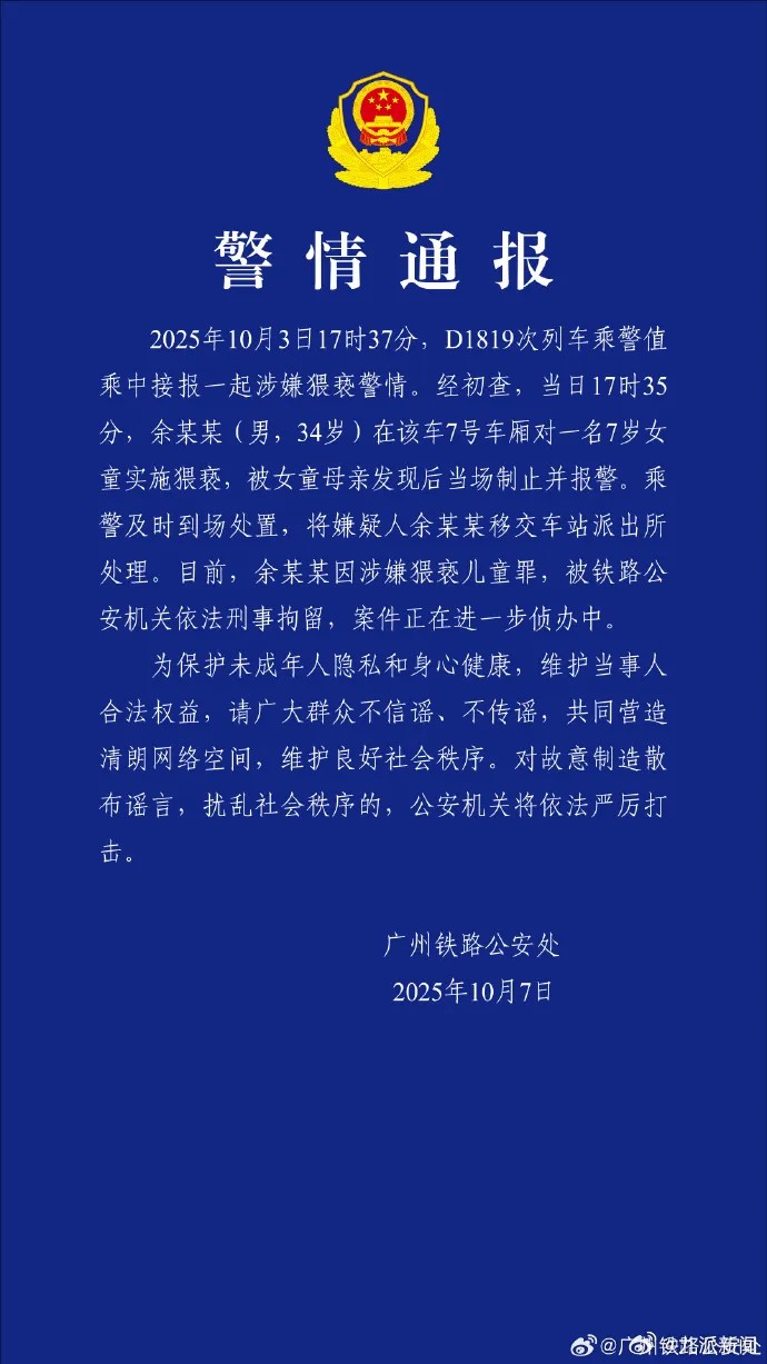 10月7日,广州铁路公安处发布警情通报称,2025年10月3日17时37分,D1819次列车乘警值乘中接报一起涉嫌猥亵警情。经初查,当日17时35分,余某某(男,34岁)在该车7号车厢对一名7岁女童实施猥亵,被女童母亲发现后当场制止并报警。乘警及时到场处置,将嫌疑人余某某移交车站派出所处理。