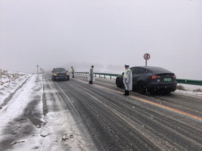 10月5日,在位于克什克腾旗境内的旅游公路热阿线,交警在雪中指挥车辆通行。