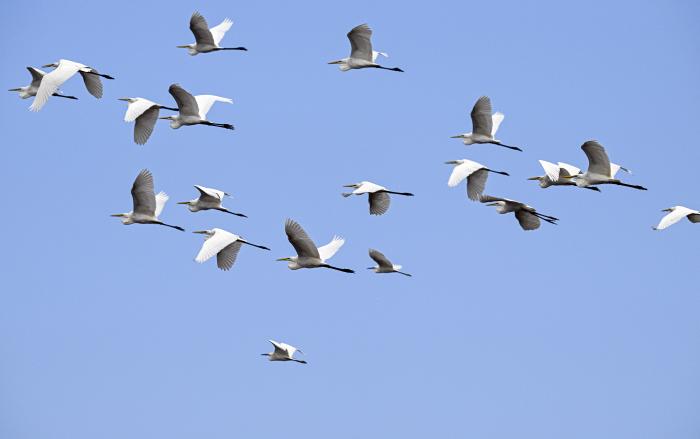 近年来,随着保护和监测不断加强,海南昌江海尾国家湿地公园已记录鸟类213种,其中国家重点保护鸟类42种,湿地生物多样性日益丰富。10月2日,成群的鹭鸟飞翔在海南昌江海尾国家湿地公园上空。