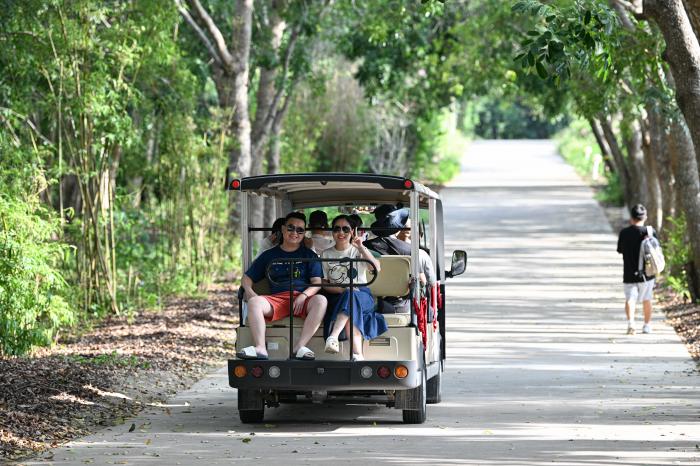 10月3日,游客乘坐观光车进入海南昌江海尾国家湿地公园游玩。
