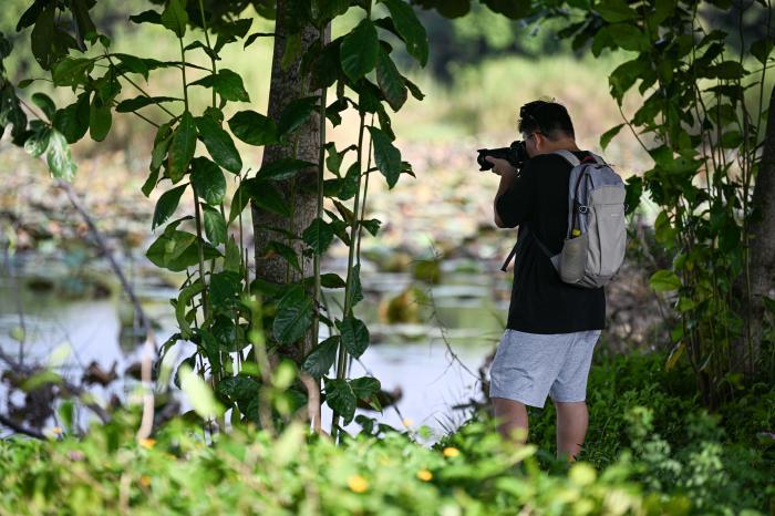 10月3日,游客在海南昌江海尾国家湿地公园游玩、拍照。