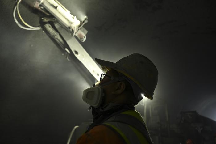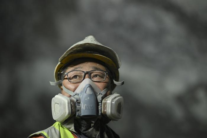 来自甘肃的工人王更兴在昭温公路西天山特长隧道左洞内施工(10月5日摄)。