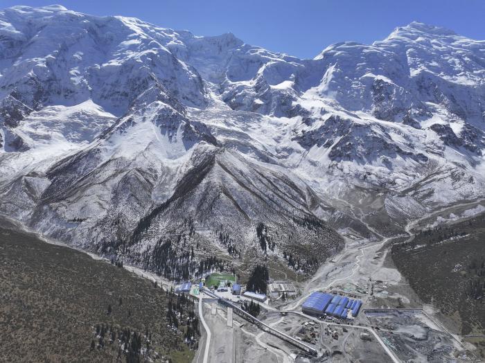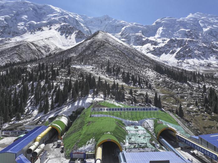 这是10月5日在新疆昭苏县拍摄的昭温公路西天山特长隧道进口端(无人机照片)。从左至右依次为平导洞、左洞、右洞。