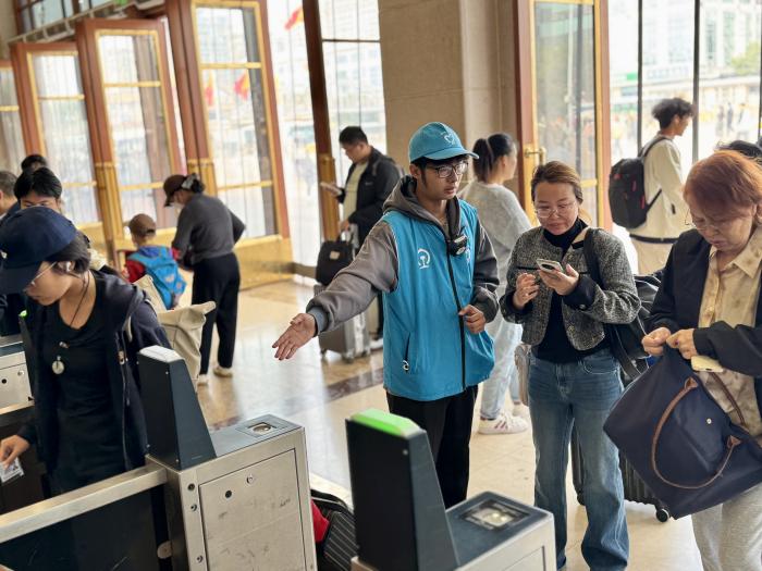 车站联动三所高校组建的275人次志愿者队伍,正以“每日55人上岗”的轮班机制坚守岗位。