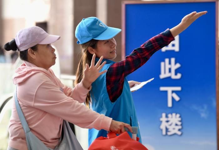 10月7日上午,志愿者正在北京站开展志愿服务。