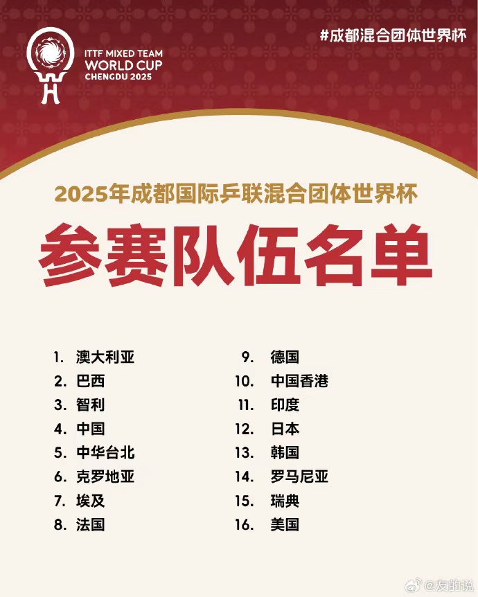2025年成都国际乒联混合团体世界杯(简称:2025年成都混合团体世界杯),将于11月30日至12月7日在中国成都举行。10月7日,国际乒联确认了16支参赛队伍。根据此前公布的消息,中国队公布的成都混合团体世界杯参赛阵容为:王楚钦、林诗栋、梁靖崑、徐瑛彬、孙颖莎、王曼昱、蒯曼和王艺迪。