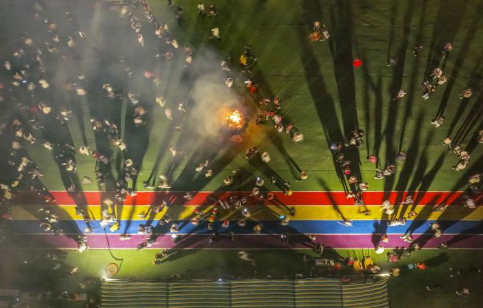 10月6日晚,游客在河北省遵化市团瓢庄镇山里各庄村稻田画景区参加篝火晚会(无人机照片)。新华社发(刘满仓摄)
