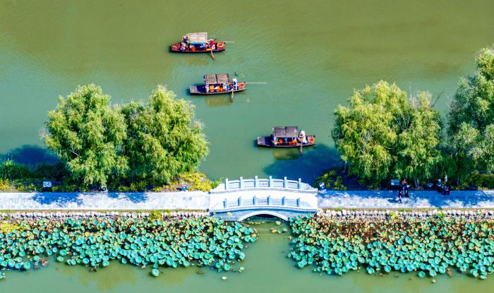 10月7日,游客在江苏兴化里下河国家湿地公园乘船游玩(无人机照片)。新华社发(周社根摄)