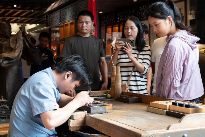 10月6日,游客在福建省福州市三坊七巷的银饰品老铺里观看非遗手工技艺。新华社记者 魏培全 摄