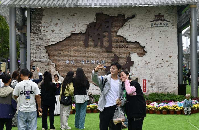 10月7日,游客在河南省开封市万岁山武侠城拍照游玩。新华社记者 郝源 摄