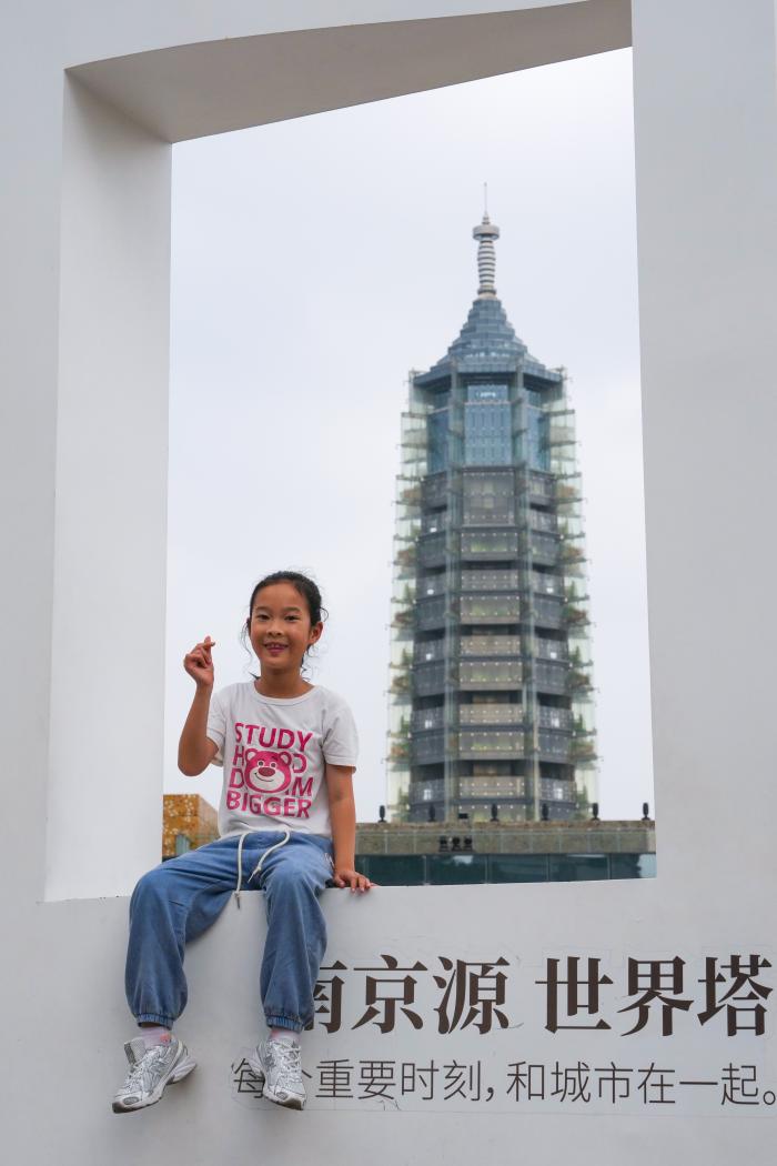10月7日,小朋友在江苏省南京市秦淮区的大报恩寺遗址博物馆拍照留念。新华社记者 李博 摄
