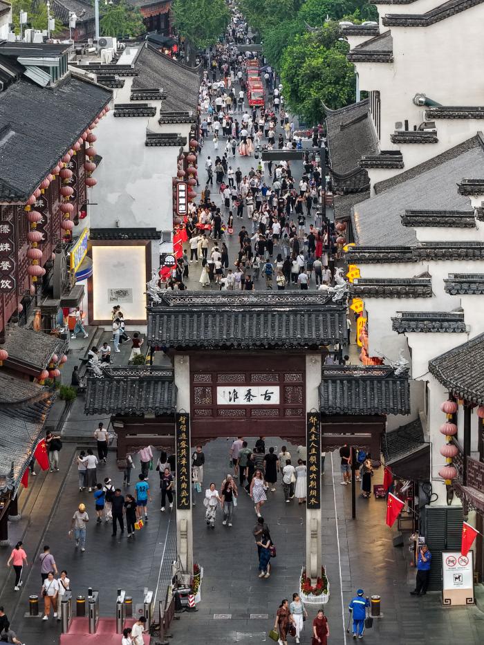 10月7日,游客在江苏省南京市秦淮区的夫子庙景区休闲游玩(无人机照片)。新华社记者 李博 摄