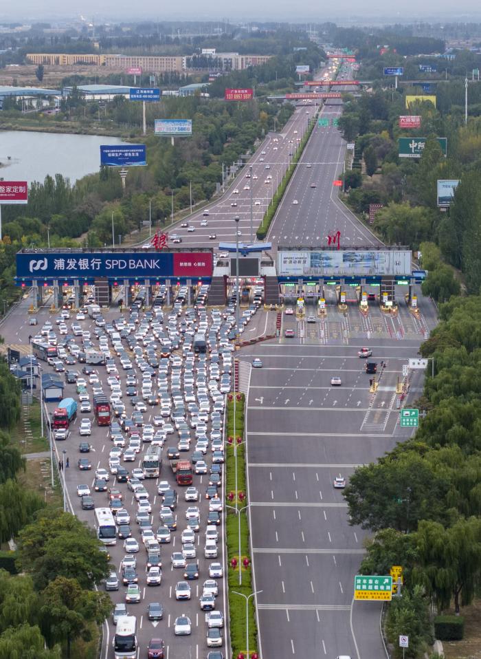10月7日拍摄的宁夏银川市银川东高速公路收费站车流(无人机照片)。新华社记者 杨植森 摄