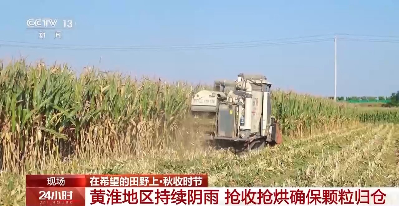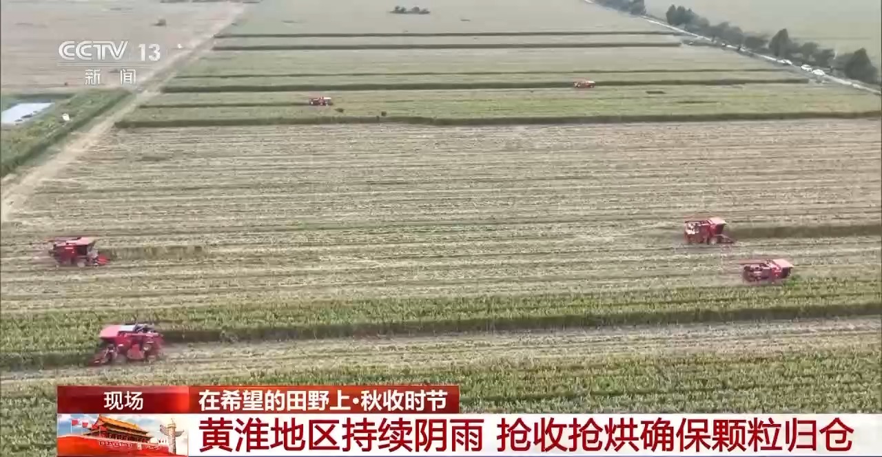 近日,黄淮地区持续阴雨导致田间泥泞,秋收进度受阻,作物易发芽霉变,各地紧急调度履带式收割机和烘干机,利用降水间隙抢收抢烘,确保秋粮颗粒归仓。