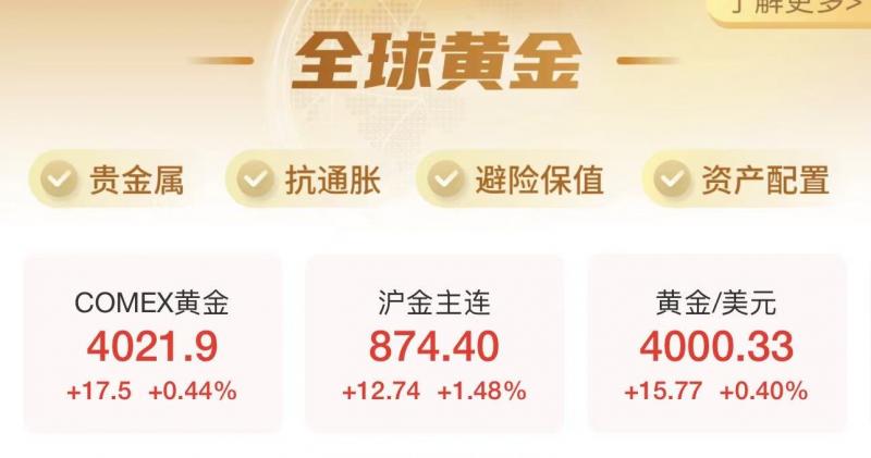 10月8日早盘,黄金期现货集体走高,现货黄金一度突破4000美元/盎司,续创历史新高;COMEX黄金期货持续走高,现报4021.9美元/盎司。