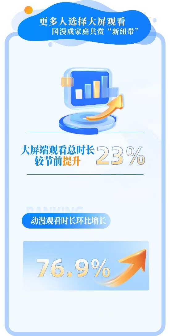 假期的线上文娱消费则呈现大屏化、沉浸式趋势。报告显示,国庆期间优酷观看时长增长主要来自大屏端,环比节前一周上涨23%。动漫、电影、综艺、纪录片四大品类涨幅最大,动漫类节目以76%的涨幅位居榜首。优酷工作人员分析称,以新国风为代表的国漫内容正在重塑客厅文化。随着80、90后成为父母,优质的国漫作品正成为连接两代人的娱乐新纽带。