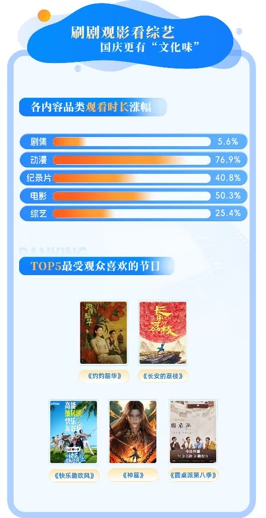 此外,《灼灼韶华》《绝命法官》等剧集、《快乐趣吹风》《百厨大战》等综艺,以及动漫《神墓》《云深不知梦》等多类型作品同样受到观众喜爱。优酷工作人员表示,国庆期间,除了传统的追剧观影刷综艺,更多观众倾向于有深度、有思想的文化类节目,也热衷体育赛事等新兴热点,这种多元化需求推动了线上内容的百花齐放。