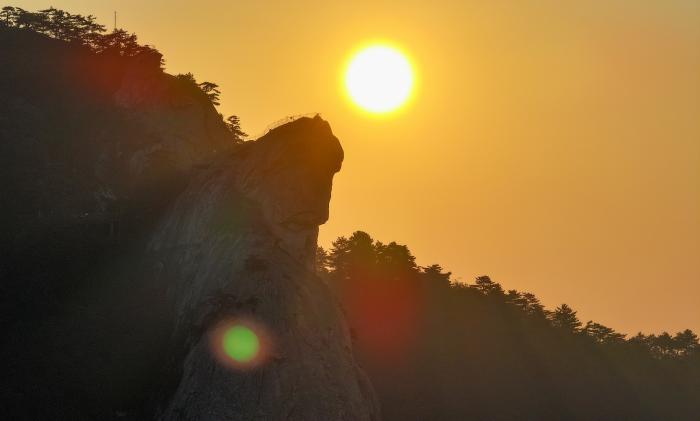 秋日清晨,初升的太阳照在湖北省麻城市龟峰山景区的奇峰怪石上,勾勒出“龟峰旭日”的壮丽景象。